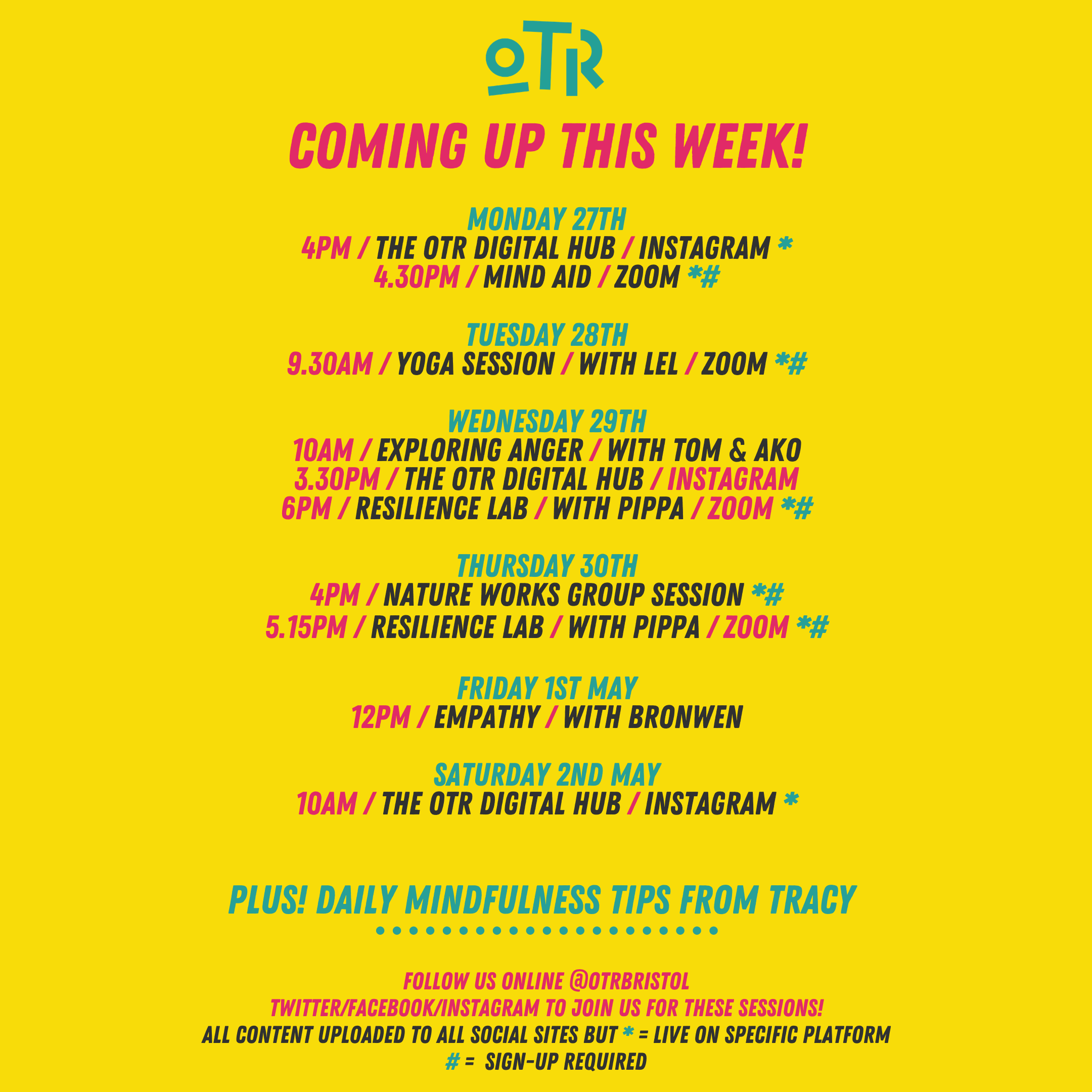 ๐ Hi everyone! Here’s what OTR has available this week. We hope you can join us for some of these sessions and broadcasts – they are all designed to support your mental health and wellbeing at this weird time.