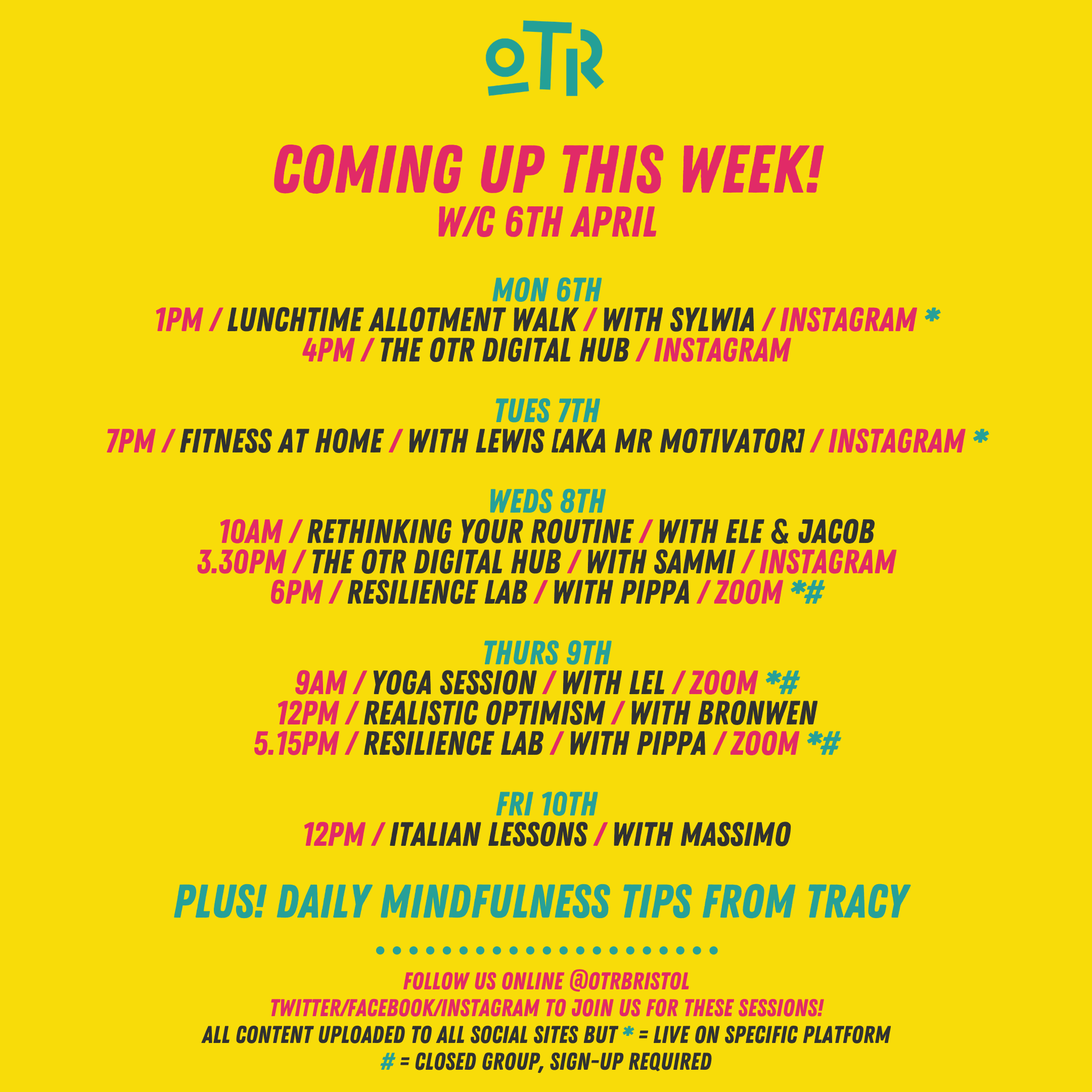 We’re now asking you to sign-up for our closed groups, meaning you get the same small, safe and familiar-feeling sessions as you would if you came to OTR in person. We’re asking that you sign up to these sessions by providing some basic contact details, so that we can be in touch and provide the info needed to join the group (such as a Google Hangout link or a Zoom code). This ensures the group remains safe, closed, and you can feel comfortable hanging out online with OTR.