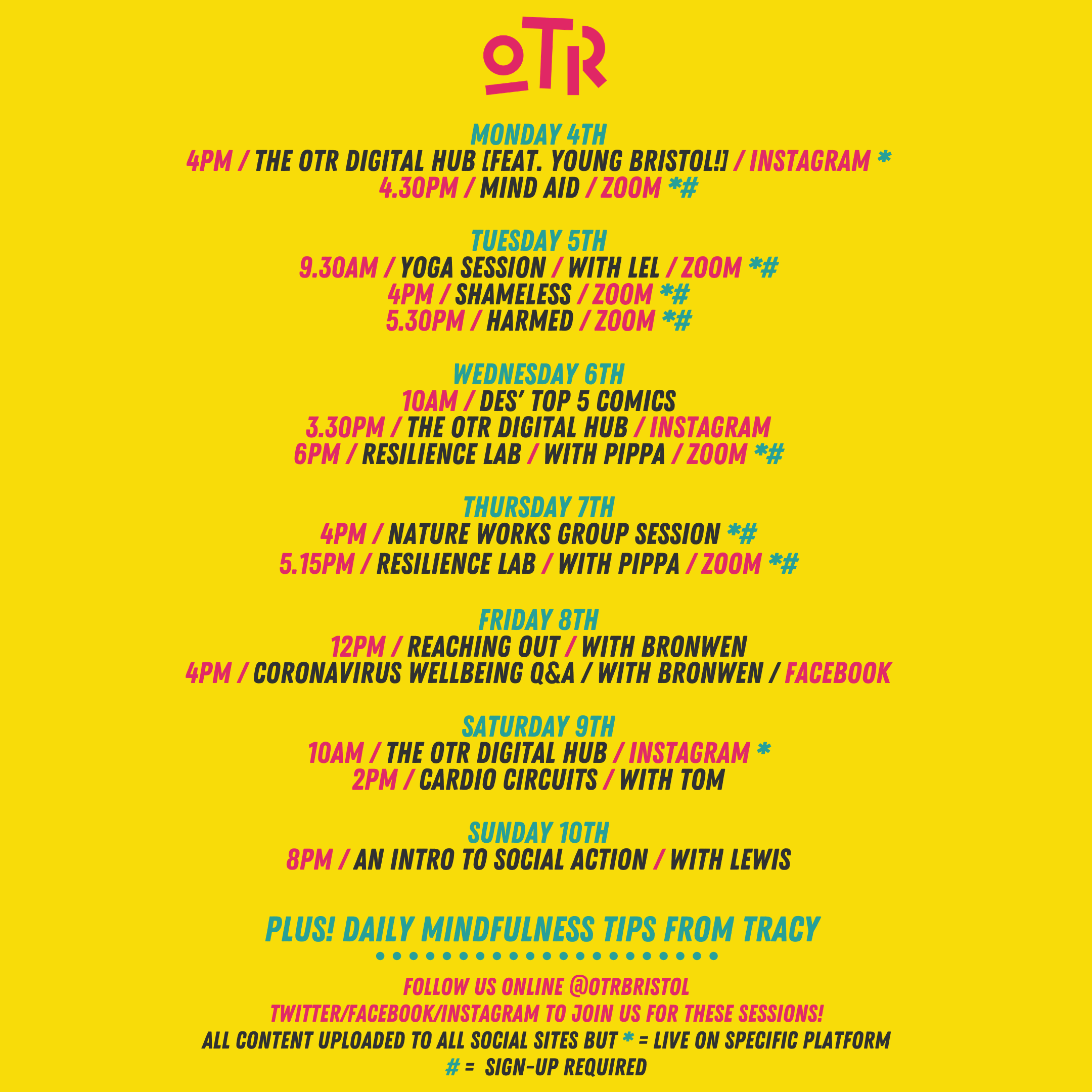 🗓️ Here’s our weekly schedule – digital sessions you can join with OTR. We’re covering a lot of ground, from fitness to comics, mindfulness to body image groups!