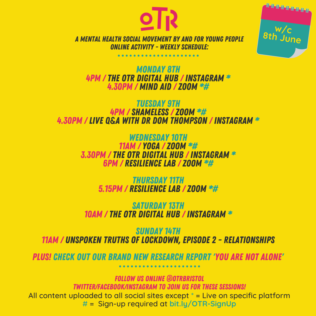 It has been a pretty intense few days and we know a lot of you may be sitting with anxieties about everything going on in the world right now. Please don’t forget that we have a number of sessions where you can join OTR online – we’re hoping you’ll find them informative and useful. The sessions are listed below – some are available to all as broadcasts and posts on social media, others are age-restricted and require a sign-up (which is super-quick and can be done here!)