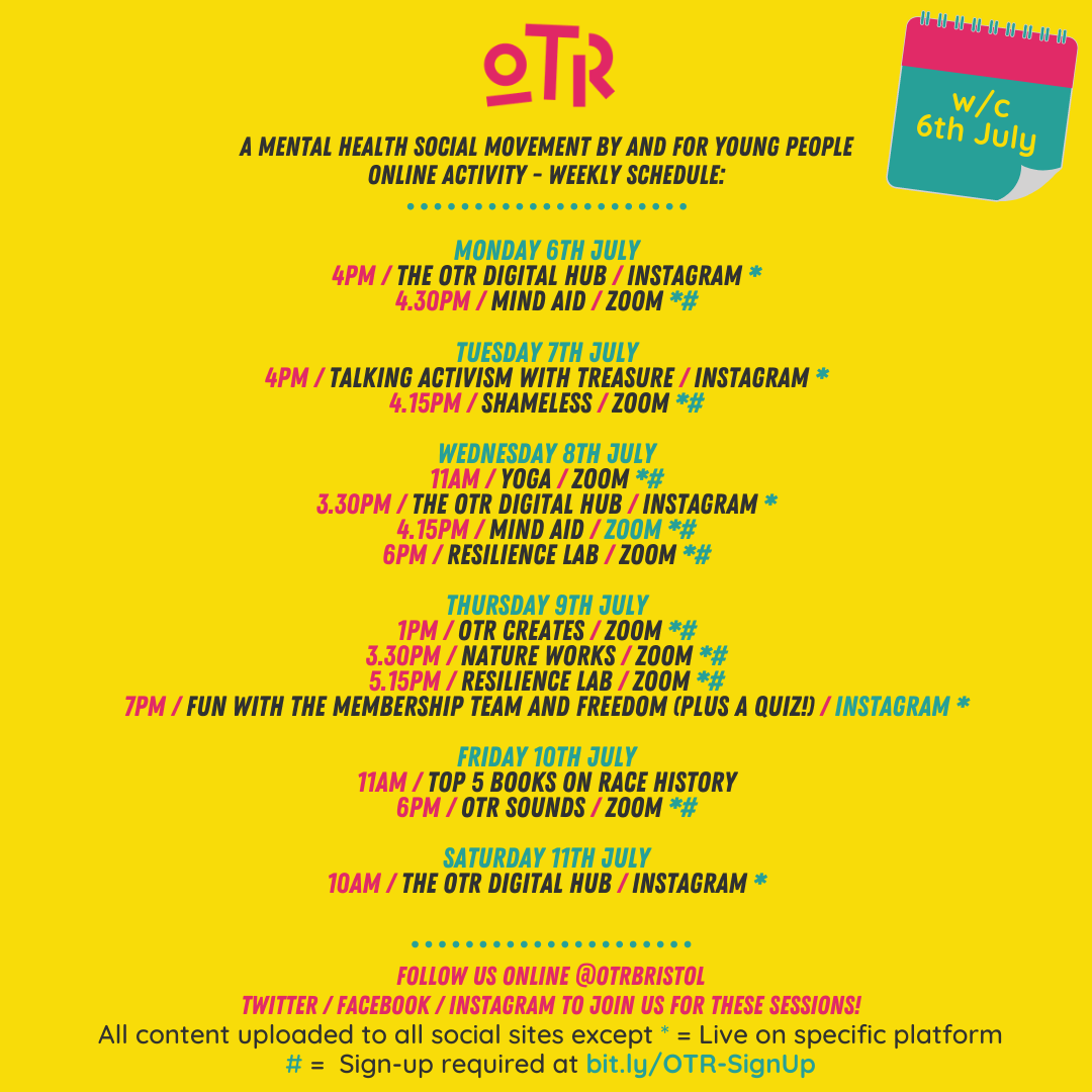Hi folks and welcome to another week! Lockdown may be starting to lift, but it’s so important to do it safely and sensibly. OTR is continuing to run all sessions online for the time being, and we’ll provide updates as and when anything changes.